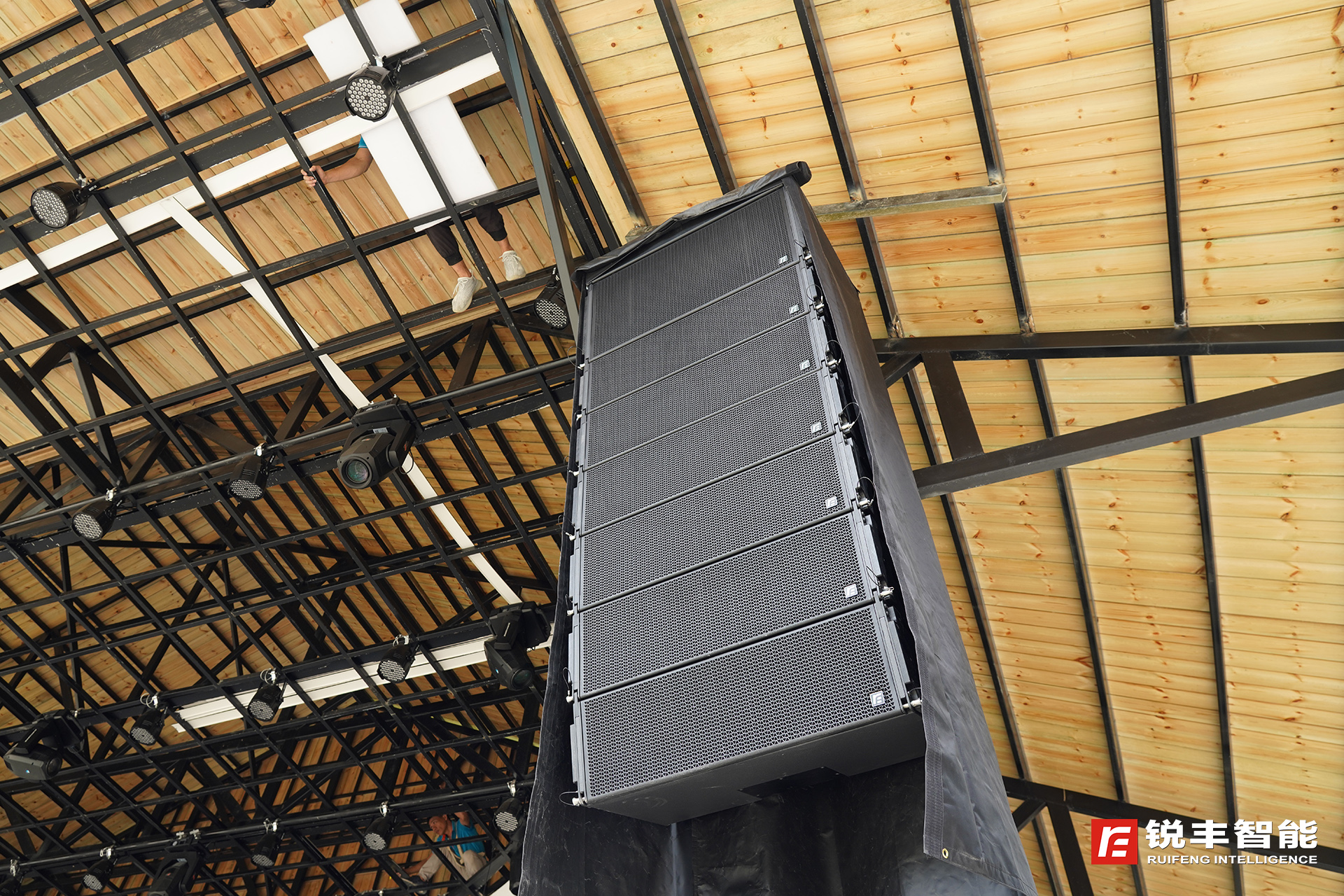 篝火广场扩声系统的左右主声道主扩音箱采用了RF VK系列线阵列扬声器,共24只VK310+三分频三驱动双10寸线阵列音箱和4只VK310S+次低频音箱;分成4组,每组线阵列音箱为6+1组合方式吊挂安装;分别覆盖主和副大型表演区域,每个区域布置了两线阵列音箱,均匀覆盖听众区,确保每个观众区域都能听到均匀一致和高清晰度的声音,VK系列线阵列音箱具有非常精准的覆盖指向,拥有出色的穿透力和高效的能量,为中大型固定及流动扩声系统提供高解析度解决方案。