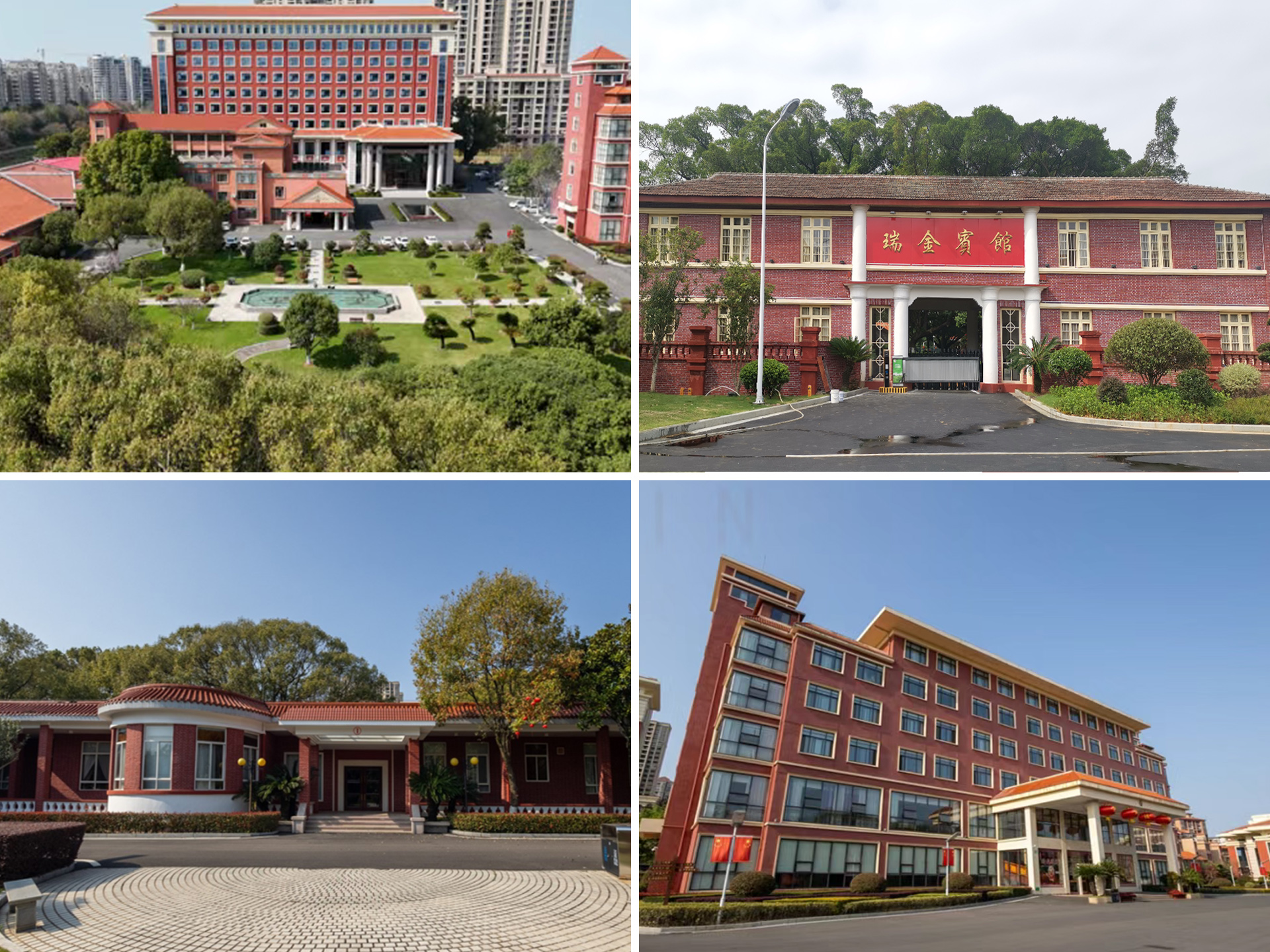 瑞金宾馆建于一九五八年,是为毛主席视察瑞金而建,素有江西的“钓鱼台国宾馆”之称,占地面积七万平方米,是江西省占地面积最大的园林式宾馆之一,为国家四星级旅游饭店和绿色旅游饭店,馆内古树参天,绿草如茵,环境幽雅。宾馆以独特的经营模式、深厚的文化底蕴,成功接待了历任党和国家领导人及众多国内外知名人士,是瑞金最主要接待场所,具有光荣的接待历史。