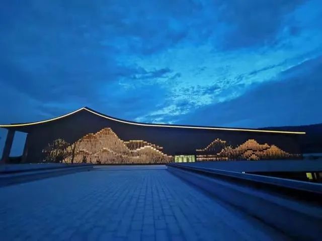当夜幕降临时,可以由多媒体控制程序控制形成一幅灵动的《富春山居图》,加上与周边山脉交相呼应的人字形屋顶,以及馆内天花板上200米长的“江水灯带”,尽显富春山水意境灵动之美。